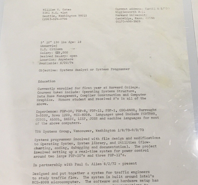 Đọc lướt qua sơ yếu lý lịch (CV) từ năm 1974 của Bill Gates, bạn sẽ phải bất ngờ khi biết được rằng trong năm học đầu tiên tại Trường Đại học Harvard, ông đã kiếm được 15.000 USD một năm, tương đương gần 75.000 USD tính theo tỷ giá đô la hiện nay (Theo số liệu của Cục Thống kê Lao động Hoa Kỳ). Một con số khá ấn tượng đối với một sinh viên đại học năm nhất.